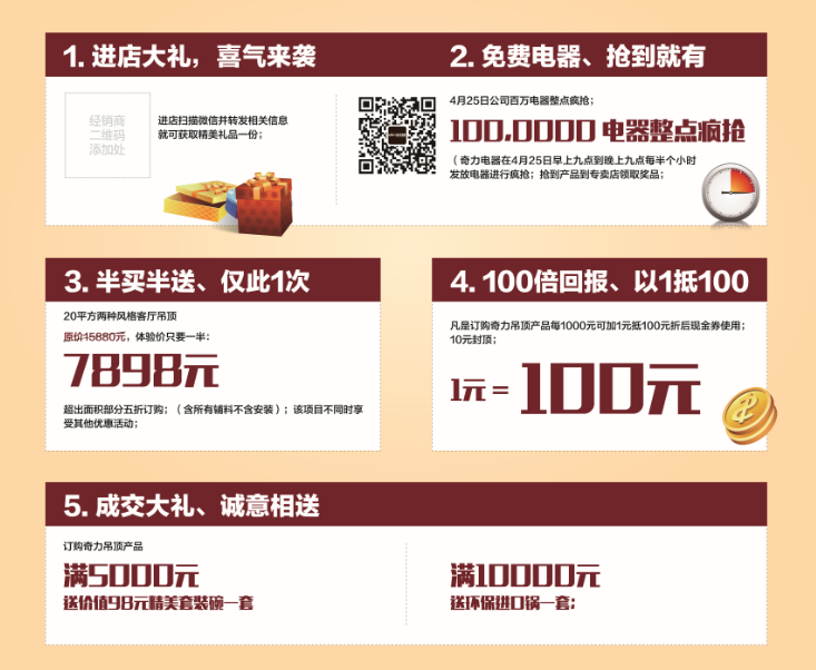 免費電器整點瘋搶。4月25日 09:00 -21:00 奇力吊頂微信公眾號定時發(fā)布電器免費禮券。搶到免費禮券即可到奇力專賣店兌換。活動當(dāng)天進(jìn)入 奇力吊頂 公眾號,發(fā)送 禮物 二字即可參與免費電器禮券活動。