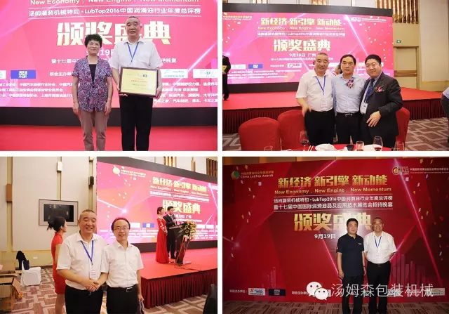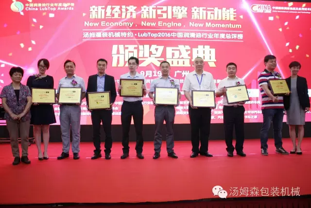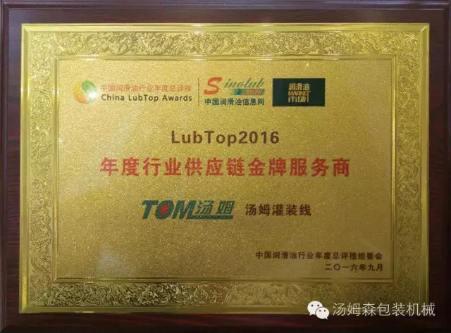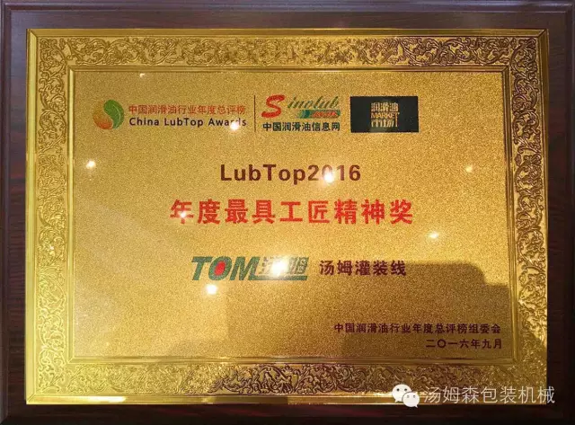 2016年9月19日,在花城廣州舉辦的“LubTop2016中國潤滑油行業(yè)年度總評榜”頒獎盛典上,江蘇湯姆集團的設備贏得了社會公眾和專家評委的廣泛認可,終榮獲“ LubTop2016年度行業(yè)供應鏈金牌服務商”和“LubTop2016 年度具工匠精神獎”兩項殊榮,湯姆集團董事長湯建華出席了頒獎盛典。這是整個潤滑油行業(yè)對湯姆集團的高度認可。
