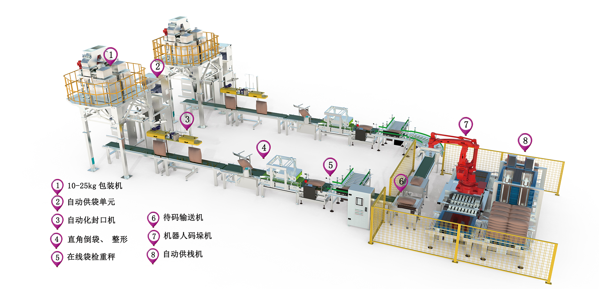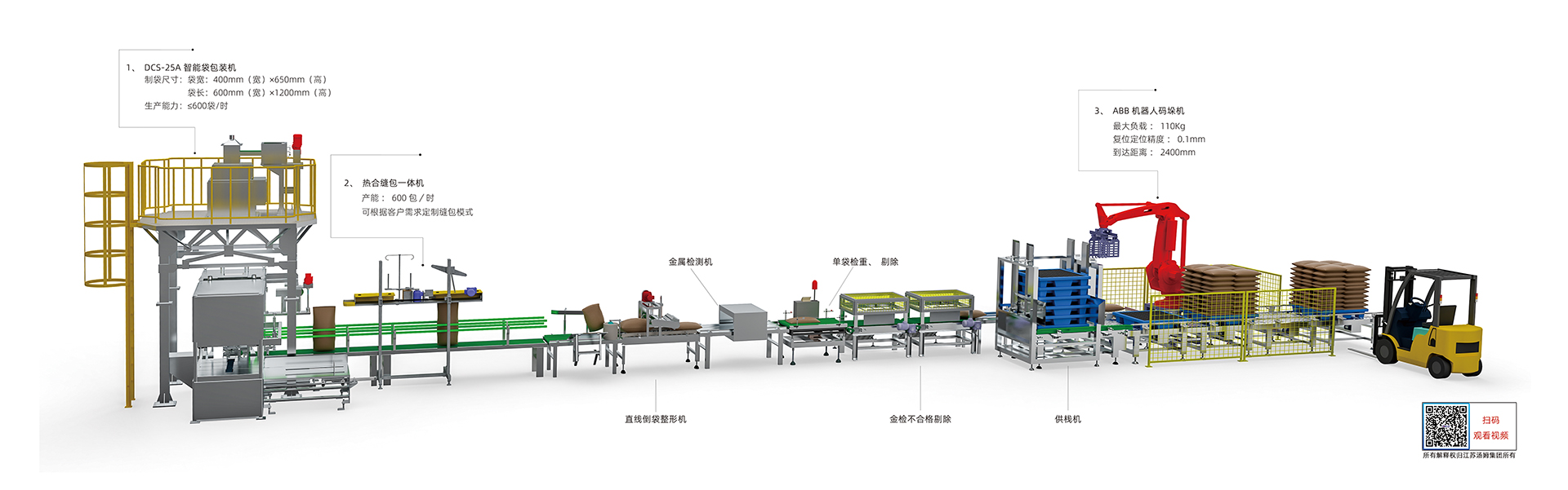 1、本線適用于農藥、化工20-50kg粉劑、顆粒等物料的包裝。